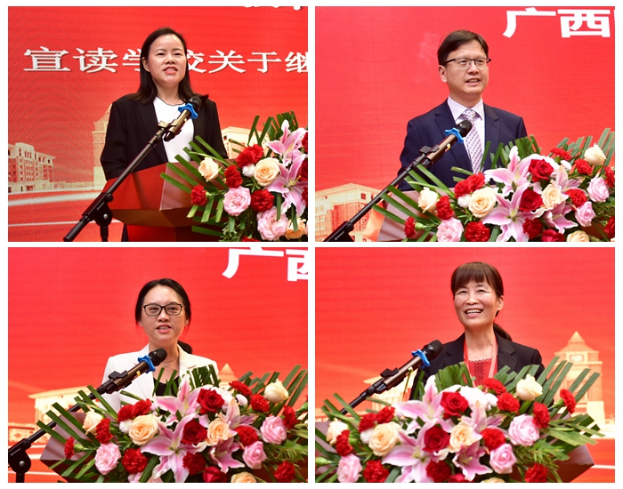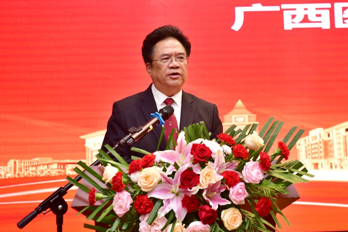南宁市第二人民医院(广西医科大学第三附属医院)副院长朱茂灵作为校友代表发言,以“幸运感、自豪感、幸福感”抒发了对母校培养之恩和感谢之情。周波会长用三组词语作表态发言,以“薪火相传,行稳致远”概括高等学历继续教育六十四年的发展历程和办学成果,以“守正创新,迎势而上”展现非学历继续教育紧跟发展转型步伐,努力创设医大培训品牌,以“星河万里,启程未来”表达,“将把校友会打造成为校友们增进往来、反哺母校、同心同德、共进共赢的平台”,共同推动继续教育高质量发展。