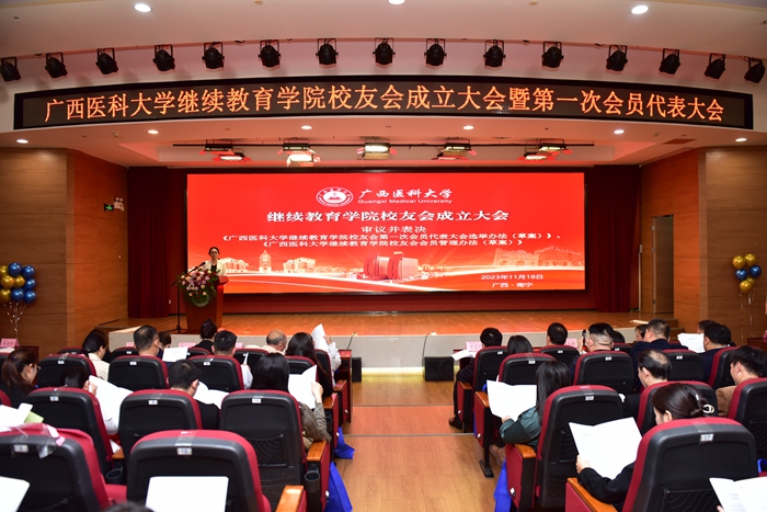 晖晖冬日暖,绵绵情谊长。2023年11月18日下午,广西医科大学继续教育学院校友会成立大会暨第一次会员代表大会在广西医科大学科技楼学术报告厅举行。学校校长、校友会会长曾志羽,学校党(校)办副主任、校友会秘书长陈玉香,继续教育学院历任领导班子代表,特邀嘉宾、教师代表、历届毕业校友代表150余人参加会议。会议由继续教育学院副院长李春燕主持。