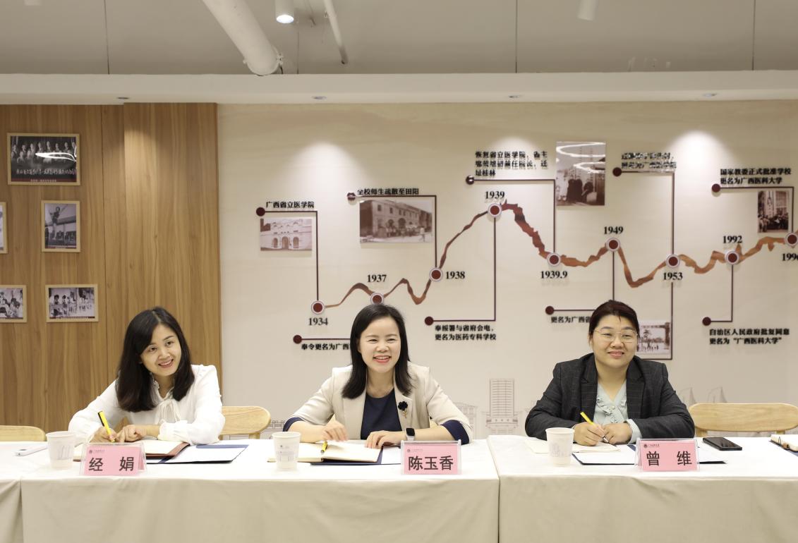 座谈会上,学校校友会秘书长陈玉香对刘梦青主任一行的到来表示热烈欢迎,并介绍了学校校友会的发展历程及各方面建设情况,强调了规范校友工作对学校发展的重要性。她表示,桂林医学院作为广西医科大学的兄弟院校,两校之间有着深厚的渊源和紧密的联系,希望两校能携手共进,凝心聚力促进医学院校校友工作的建设和发展。