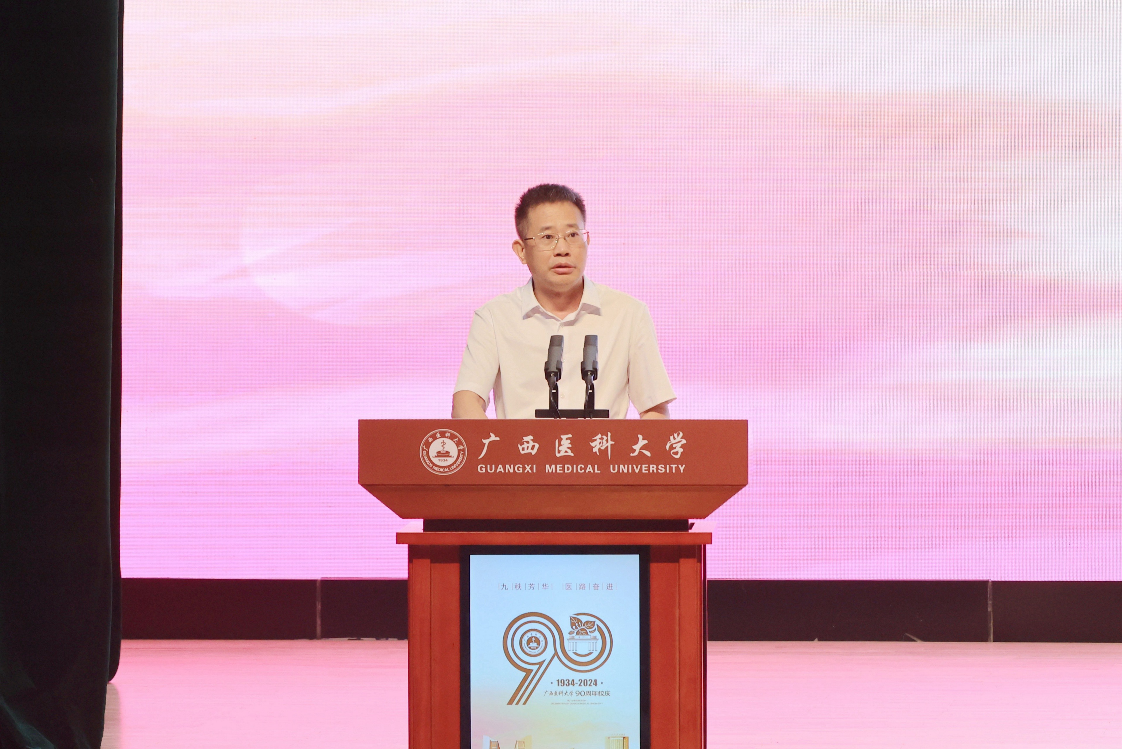 曾志羽校长回顾了90年来医大人秉持初心、风雨兼程,励精图治、薪火相传,在风雨浸润中铸就心系黎民、忠诚奉献的红色根基,回忆了学校培养了各类各层次优秀人才,在时光峥嵘中谱写了广西乃至全国医学诸多领域从无到有、从有到优、从优到精、从精到强的精彩华章,他代表学校向为学校自愿捐赠的集体、个人和广大师生、医护员工表示诚挚感谢和崇高敬意。
