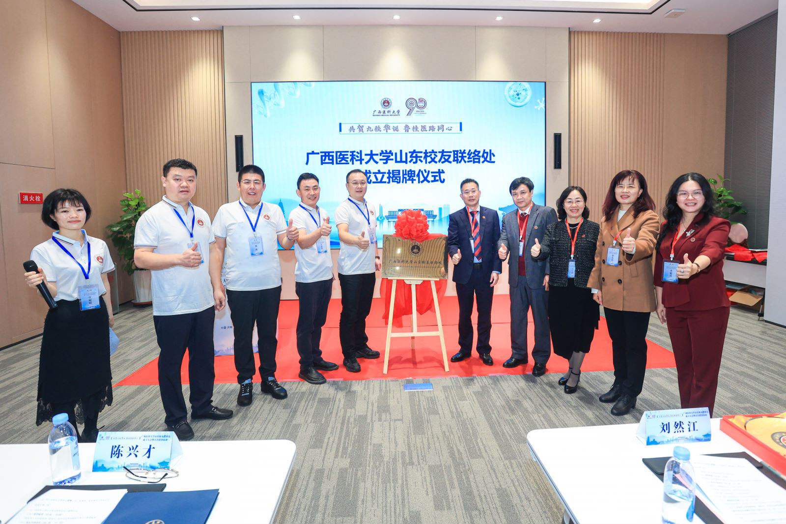 山东校友联络处筹备组组长吴书志代表筹备组向本次大会作筹备工作汇报并致欢迎辞。学校校友工作办公室主任李毅昂代表校友会宣读《关于同意成立广西医科大学山东校友联络处的批复》并公布了批复的山东校友联络处第一届理事会成员名单。随后,陈兴才、韦锦斌、王宇清、罗小玲为首届理事会成员颁发了聘书,并为山东校友联络处现场揭牌。
